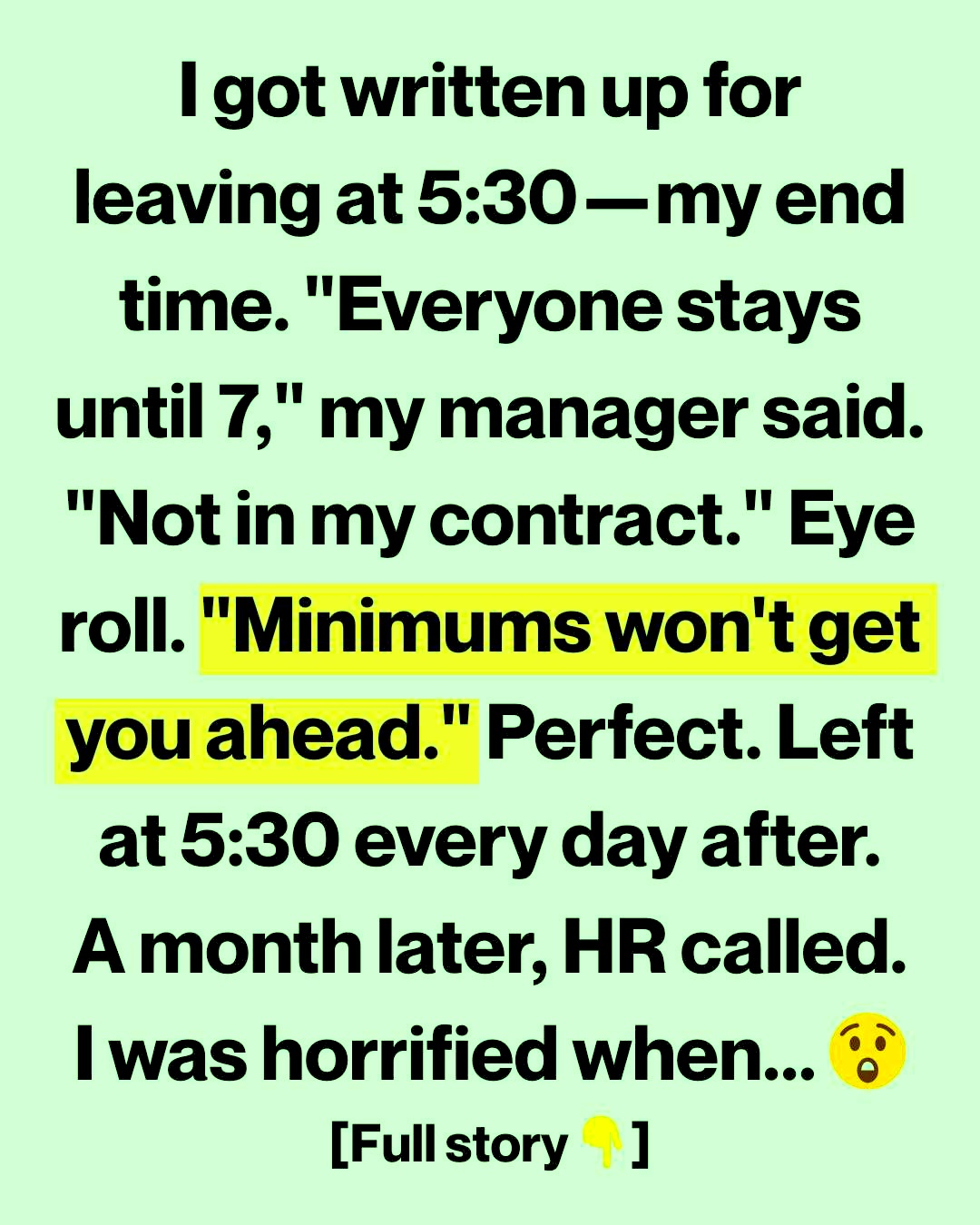 I stayed calm and replied, “That’s not in my contract. My hours are 9 to 5:30.” She rolled her eyes and shot back, “Well, doing the minimum won’t get you ahead here.”