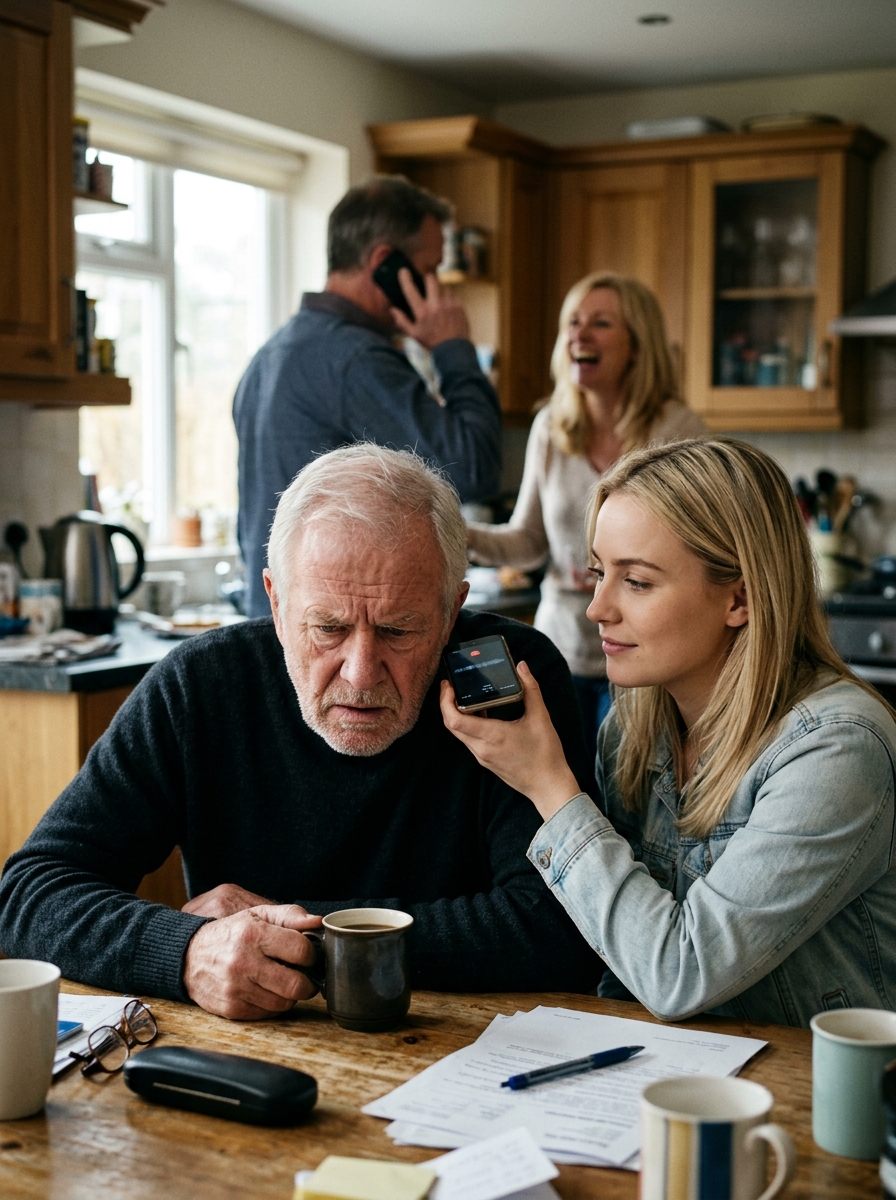 My phone lit up at 6:00 a.m. “Grandpa passed last night,” my father said, flat and impatient. “Heart attack. We need the safe combination before the bank locks everything down.” In the background, I heard my mother laugh. “About time. Call the broker. We’re selling by noon.” I didn’t fight them. I didn’t even lower my voice. I just put the call on speaker, because Grandpa was sitting right beside me at the kitchen table, very much alive, drinking his coffee in silence. Then he leaned toward the phone and said one word…