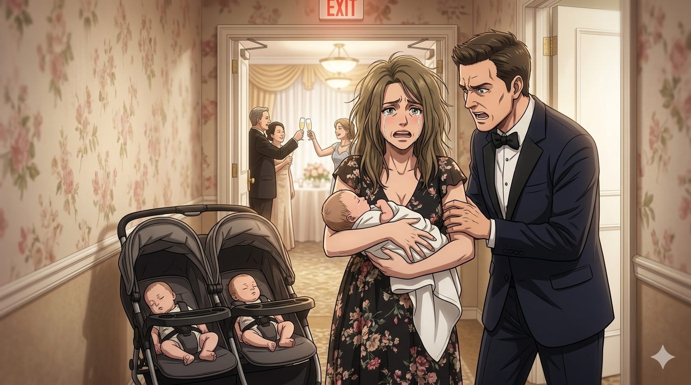 I stood near a marble pillar, one twin sleeping against my shoulder while the other fussed softly in a stroller beside me. My dress clung uncomfortably to my still-healing body, and the hem brushed against swollen ankles that had barely recovered from pregnancy.
