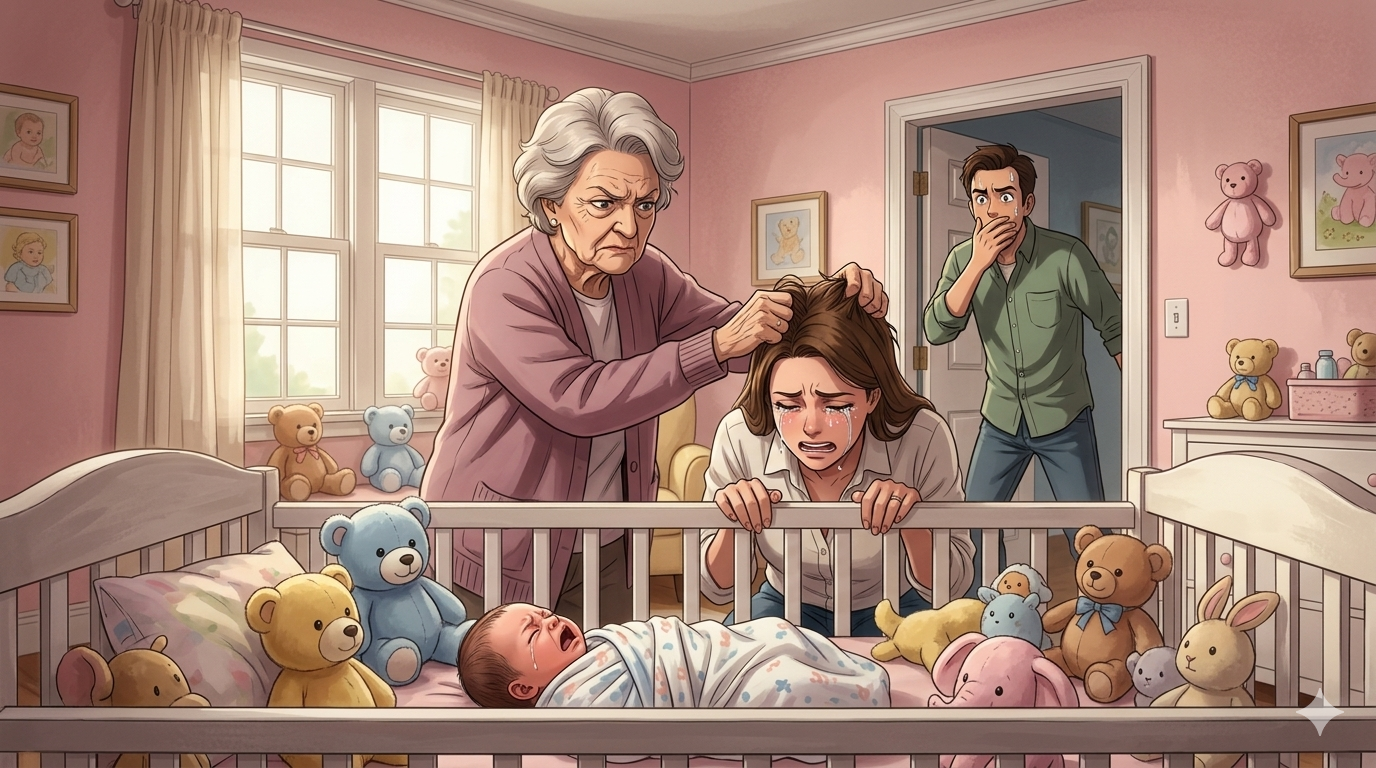 My mother stood near the changing table, holding a stack of clean baby blankets. She turned to me with a flawless, practiced smile.